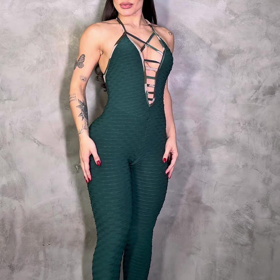Stand out with the Scrunch Booty Green and Camouflage Detail Jumpsuit. Featuring a vibrant green base with bold camouflage accents, this jumpsuit enhances your curves with its flattering scrunch design. Combining unique style and comfortable support, it’s perfect for confident workouts or stylish everyday wear.