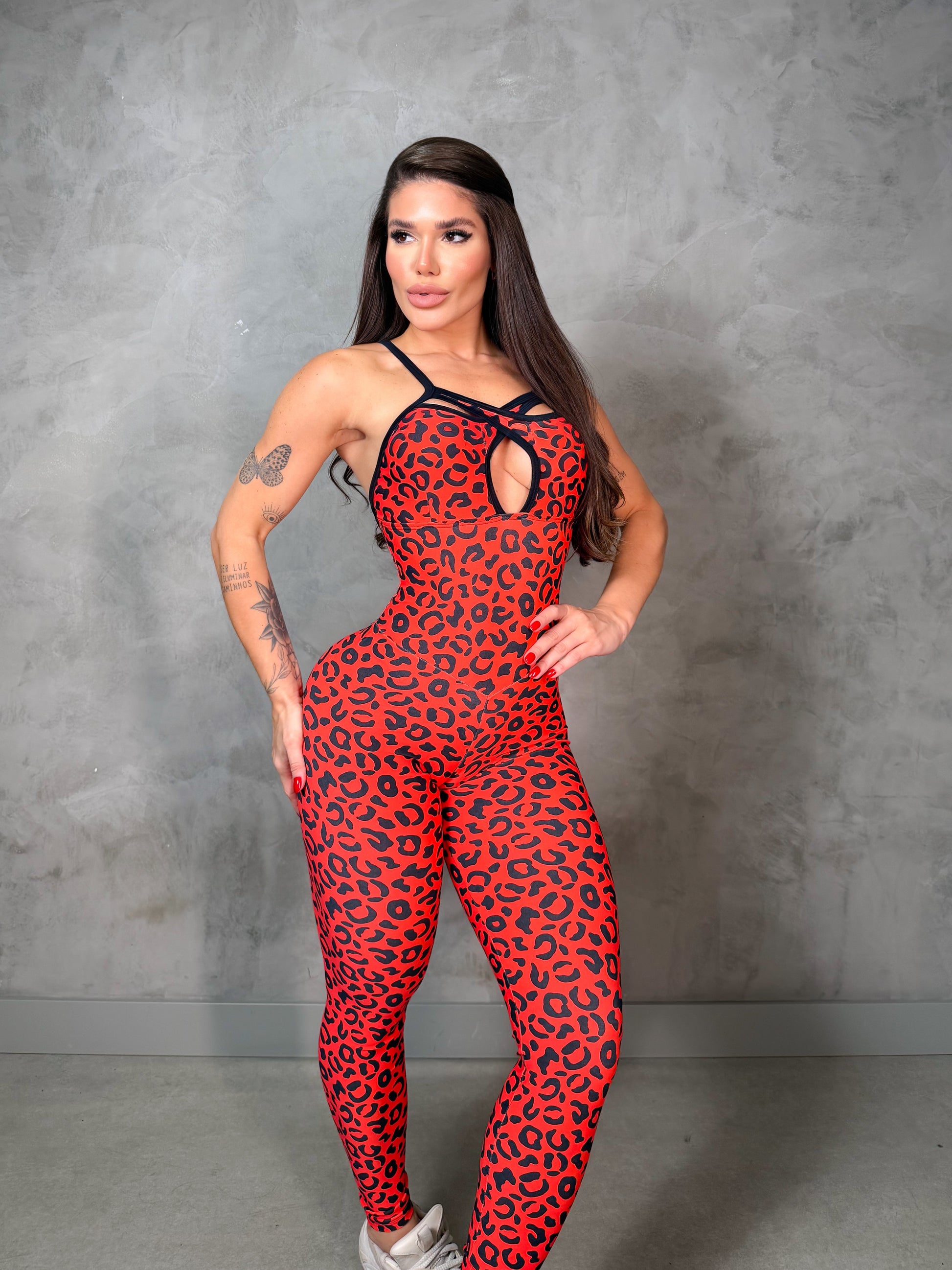 SCRUNCH BOOTY RED LEOPARD FRONT DETAIL JUMPSUIT, NO RETURN